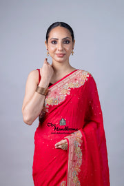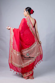 • Elevate your style with our exquisite Hot Pink Khaddi Georgette Handloom Banarasi Saree. Made with intricate handwork, this saree features Gota Patti, Zardozi, Diamond Chain, Katdana, and Abla detailing, adding a touch of elegance and luxury. Crafted with premium quality khaddi georgette, this saree offers comfort and sophistication, making it a must-have for any occasion