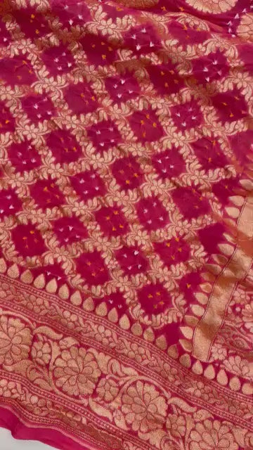- A celebration of Indian textile arts! This handwoven Banarasi saree has been hand-dyed in the classic Kutchi Bandhani technique. A gorgeous geometric pattern in zari to bring on the festive spirit!