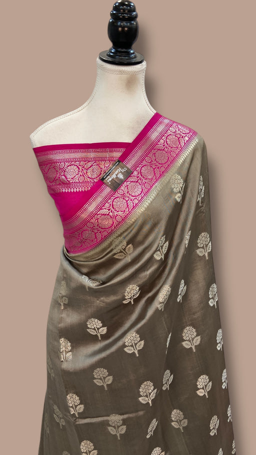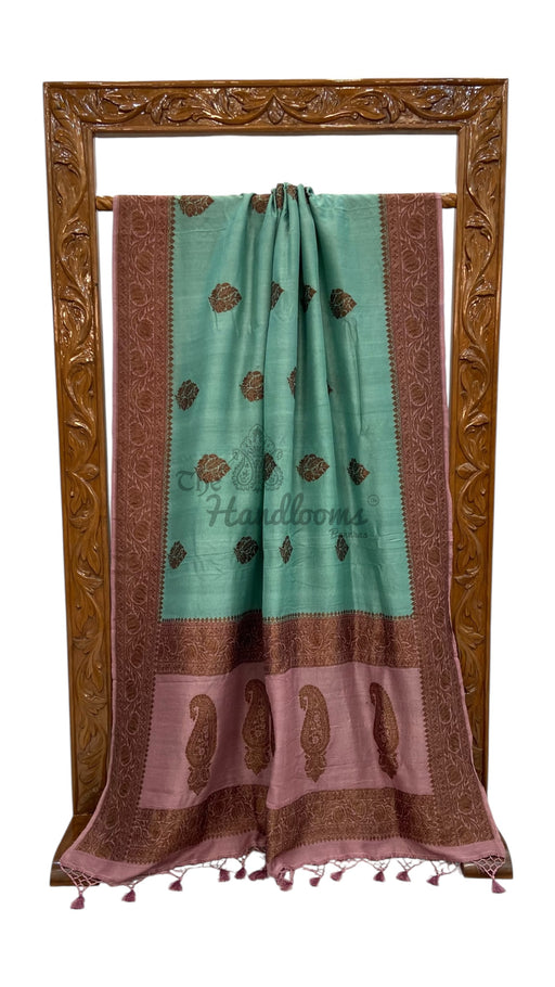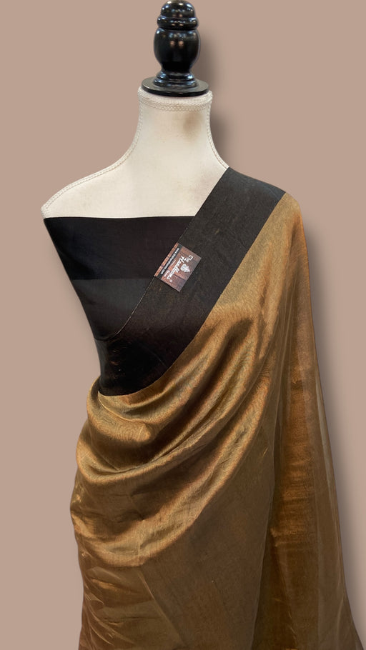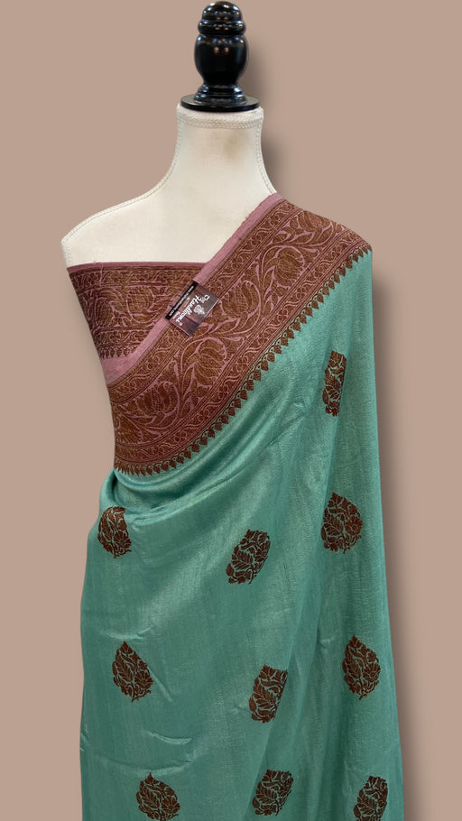 Discover the timeless elegance of authentic Tussar silk craftsmanship. This handloom Banarasi saree showcases the finest pure Tussar fabric, reno...
