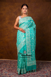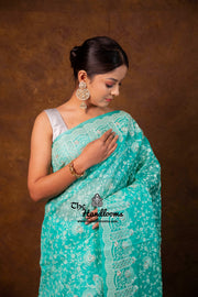 Pure Organza Chikankari Handloom Banarasi Saree Crafted from lightweight pure organza, this Banarasi saree showcases intricate chikankari embroidery—a centuries-old hand-embroidery technique that adorns the fabric with delicate floral and geometric patterns. The organza base offers a subtle sheen and breathable drape, making it ideal for warm-weather occasions while maintaining the grandeur of traditional Banarasi weaving. Each piece is handwoven by master artisans, ensuring authenticity and exclusivity. Perfect for festive celebrations, weddings, and formal gatherings, this saree balances heritage craftsmanship with contemporary elegance. The fine detailing and premium fabric quality reflect the artisanal excellence The Handlooms is known for