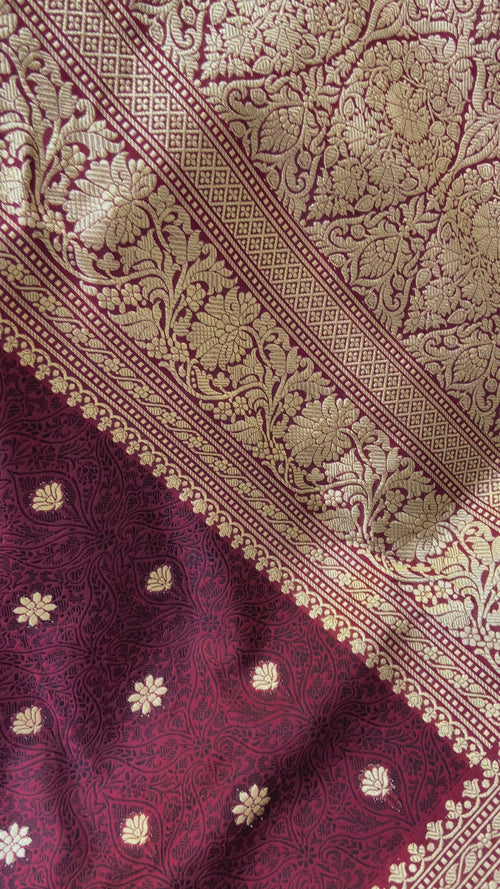 • Speciality - The glorious outline of kadua border lovingly handwoven on a base of resplendent silk in Sona or Gold zari kadua motifs. Incredible in its details and a mirror to the splendour of Banaras.