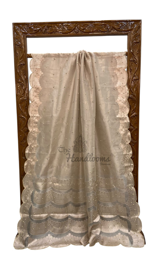 View full detailsExperience the timeless elegance of authentic Banarasi craftsmanship with this Pure Kora Silver Tissue saree. Meticulously handwoven using traditio...