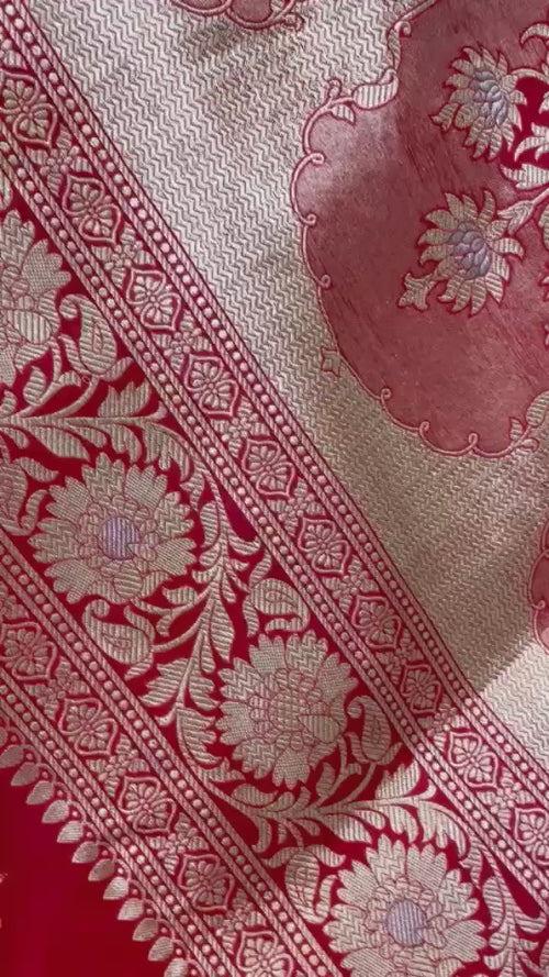 Red Pure Katan Silk Banarasi Handloom Saree - All over Sona Roopa Jaal work