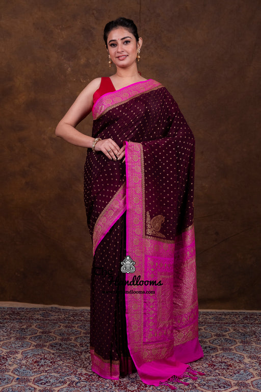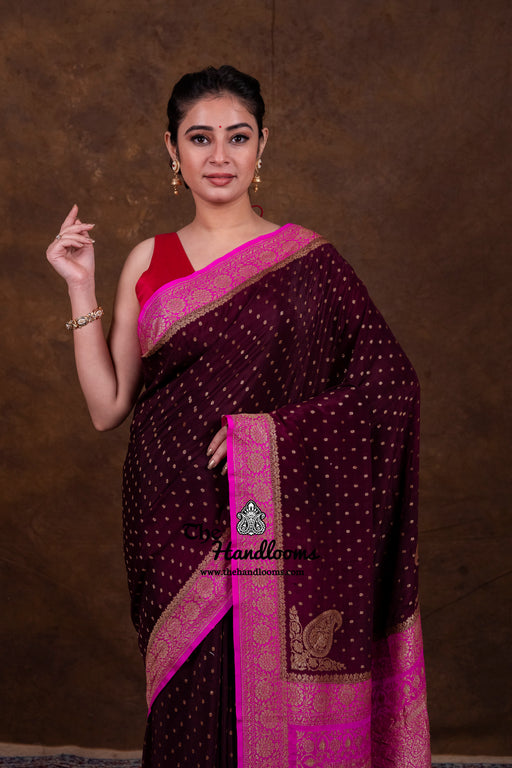View full detailsThis Pure Khaddi Crepe Georgette Brocade Handloom Banarasi Saree exemplifies exquisite craftsmanship, blending the delicate texture of crepe geor...
