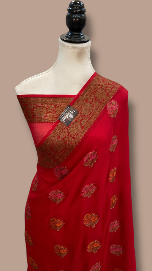View full detailsExpertly crafted from pure katan silk using traditional handloom techniques, this Red Banarasi saree features exquisite all-over motifs. With it...