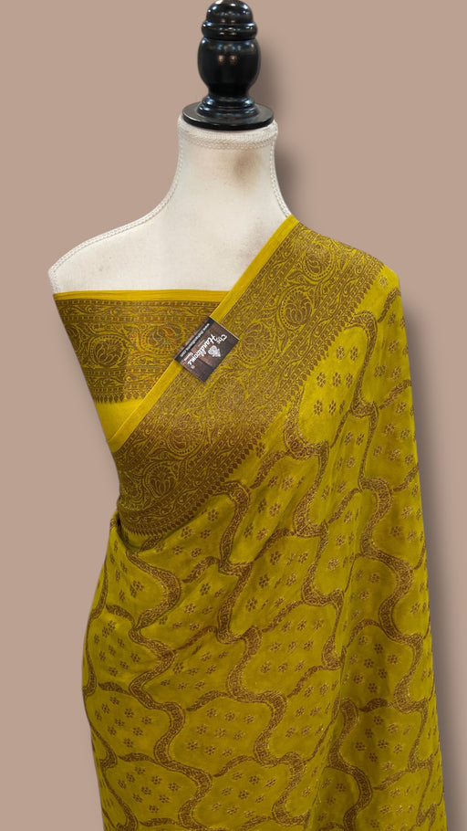 View full detailsIndulge in the exquisite charm of tradition with this Pure Mango Silk Banarasi Handloom Saree, crafted to perfection by skilled artisans. The rich,...