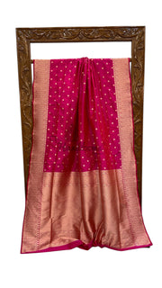 • Expertly crafted from pure katan silk using traditional handloom techniques, this Hot Pink Banarasi saree features exquisite all-over motifs. With its luxurious fabric and intricate designs, this saree is the perfect choice for any special occasion, adding elegance and sophistication to your wardrobe