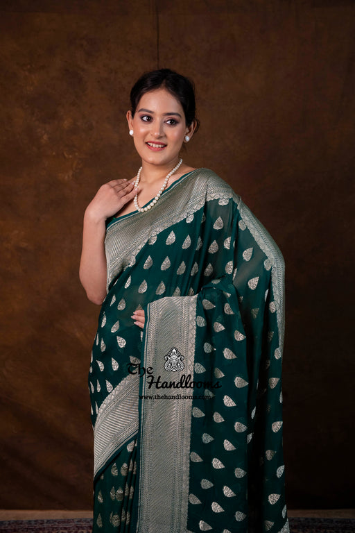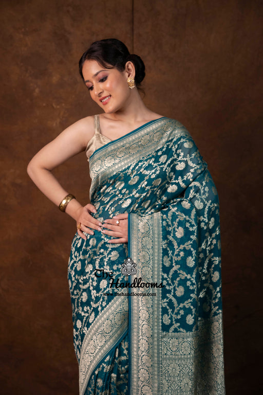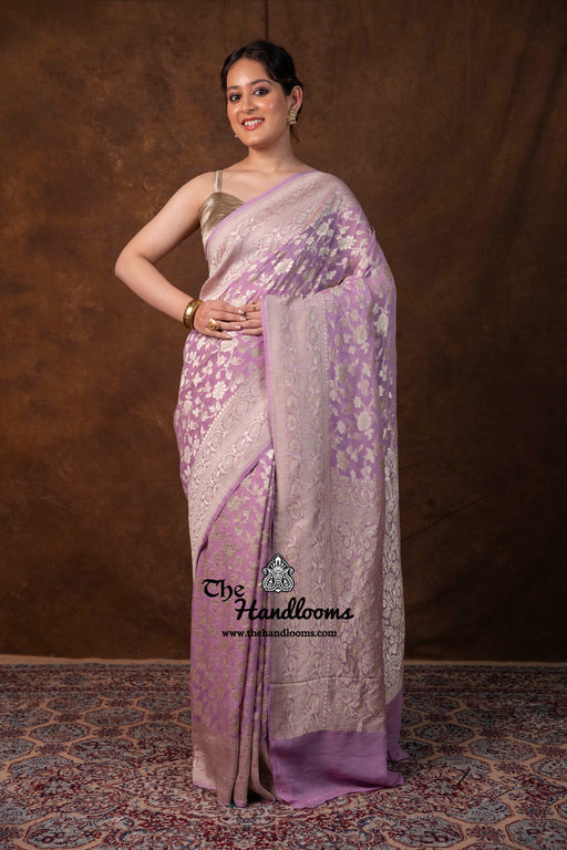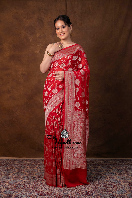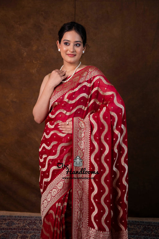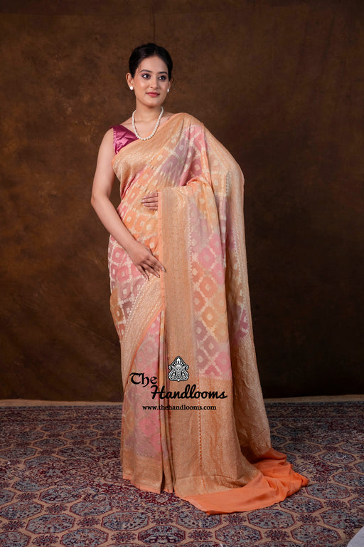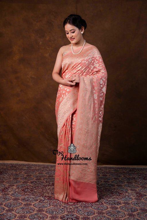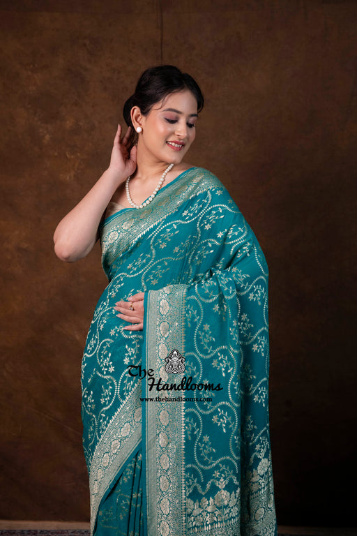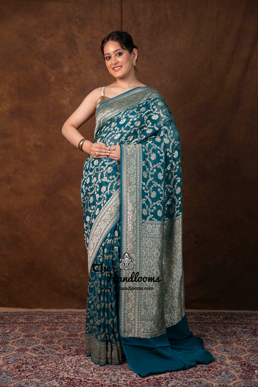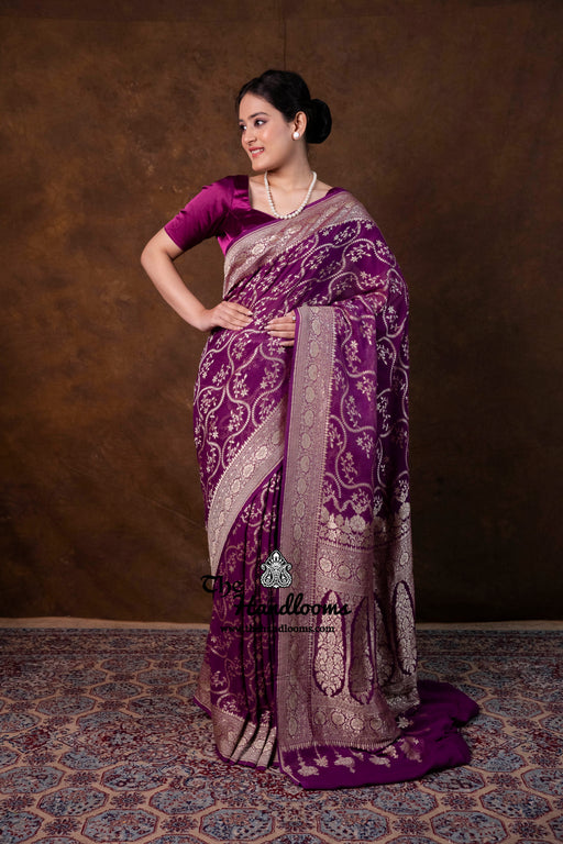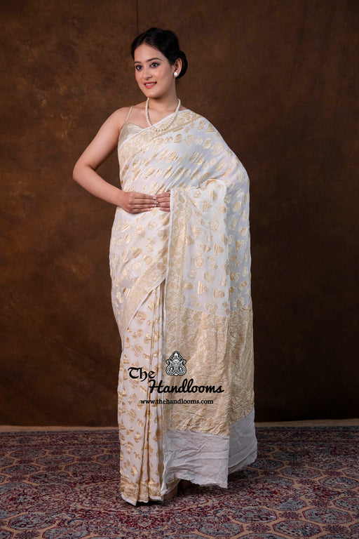 View full detailsExperience the timeless elegance of authentic Banarasi craftsmanship with this Khaddi Georgette handloom saree, distinguished by its exquisite Wa...