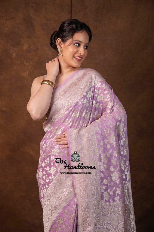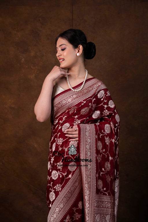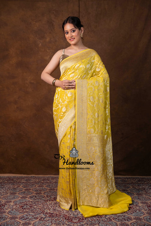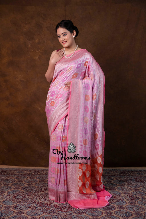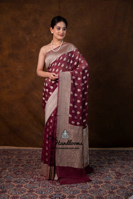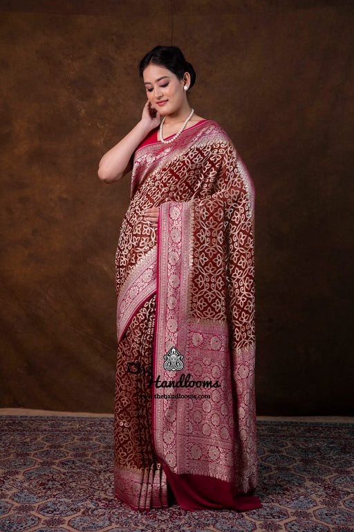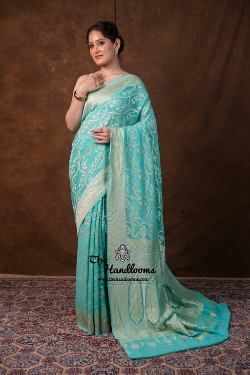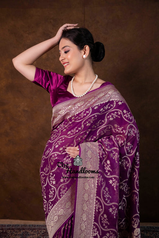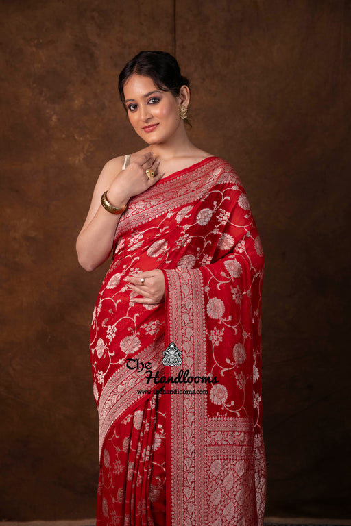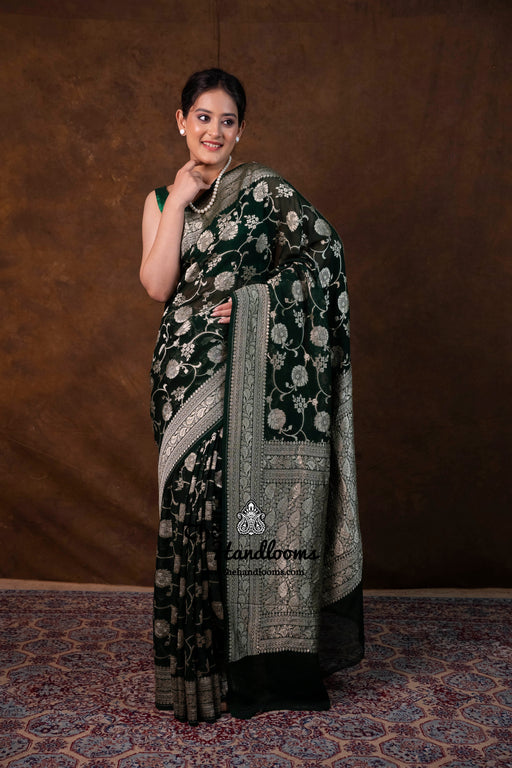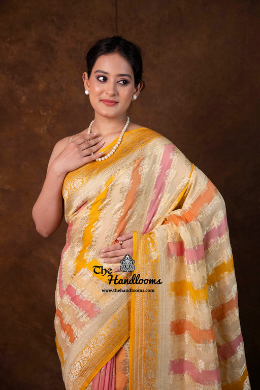 View full detailsExperience the timeless elegance of authentic Banarasi craftsmanship with this Khaddi Georgette handloom saree, distinguished by its exquisite Wa...