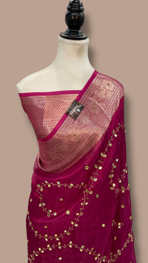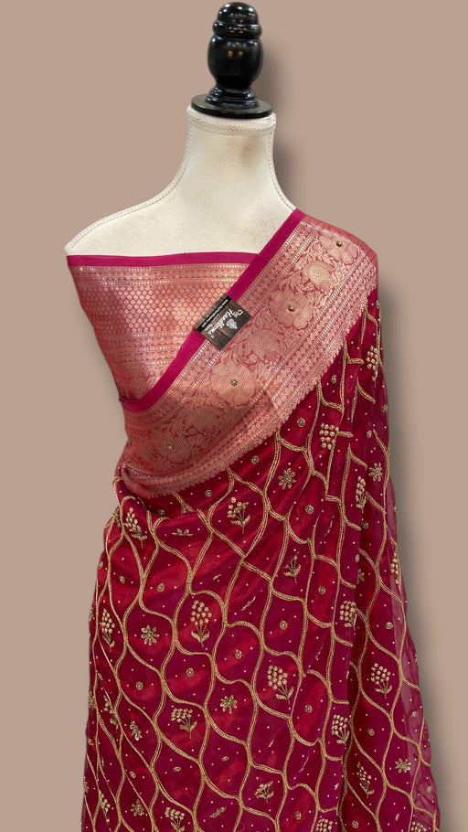 View full detailsElevate your style with our exquisite Maroon Khaddi Georgette Handloom Banarasi Saree. Made with intricate handwork, this saree features Gota Pat...