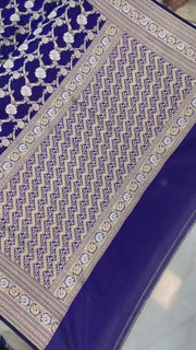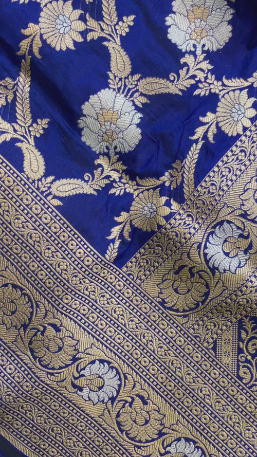 Navy Blue Blue Pure Katan Silk Banarasi Handloom Saree - All over Sona Roopa Jaal work