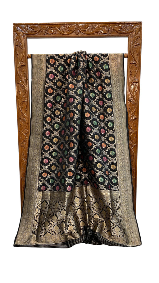 View full detailsCrafted from luxurious moonga georgette, this handloom Banarasi saree exemplifies traditional weaving mastery. The delicate fabric drapes with et...