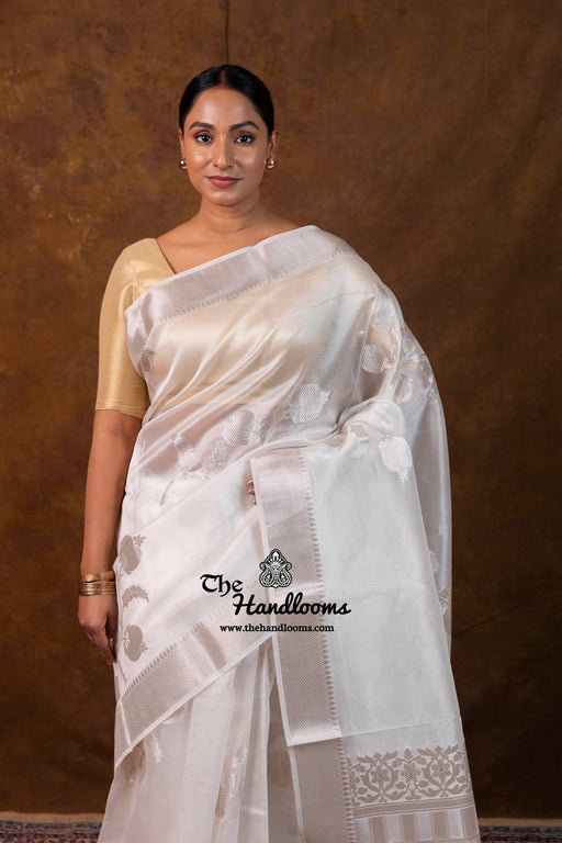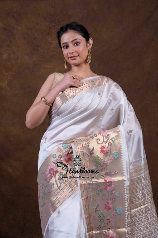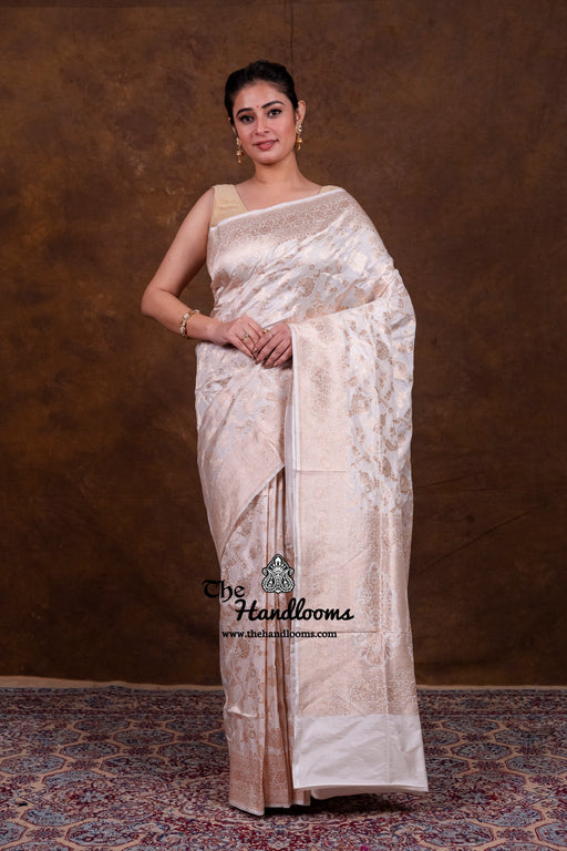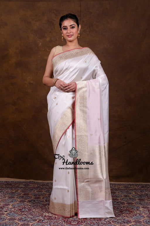 White Pure Katan Silk Banarasi Handloom Saree - Tanchui Brocade