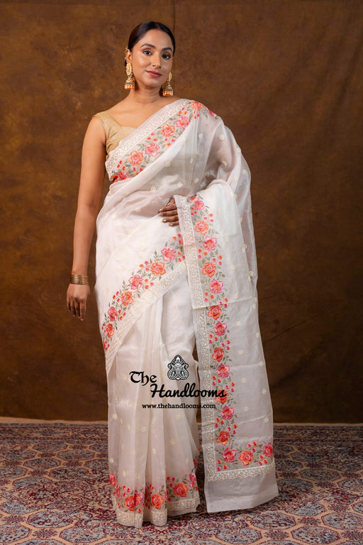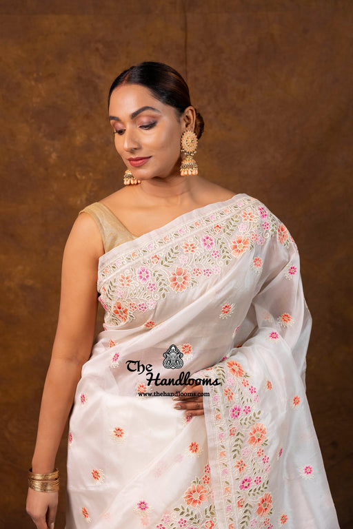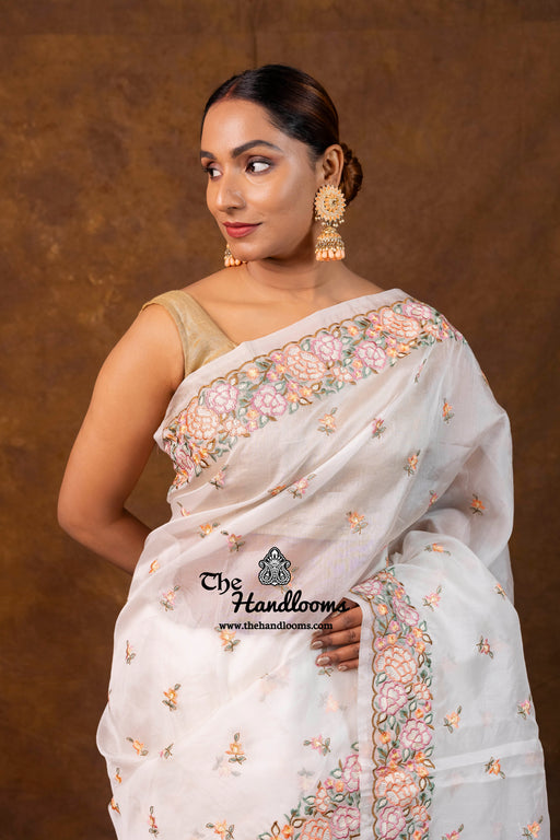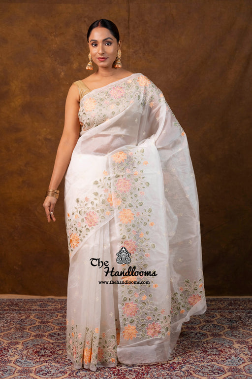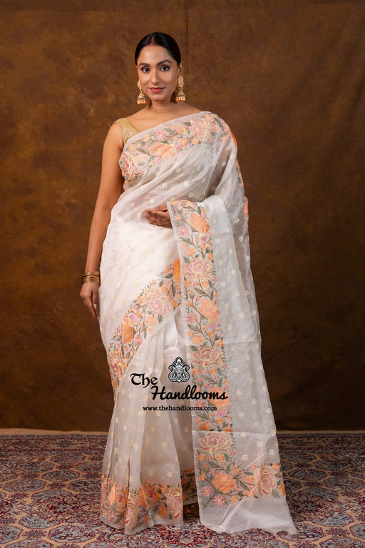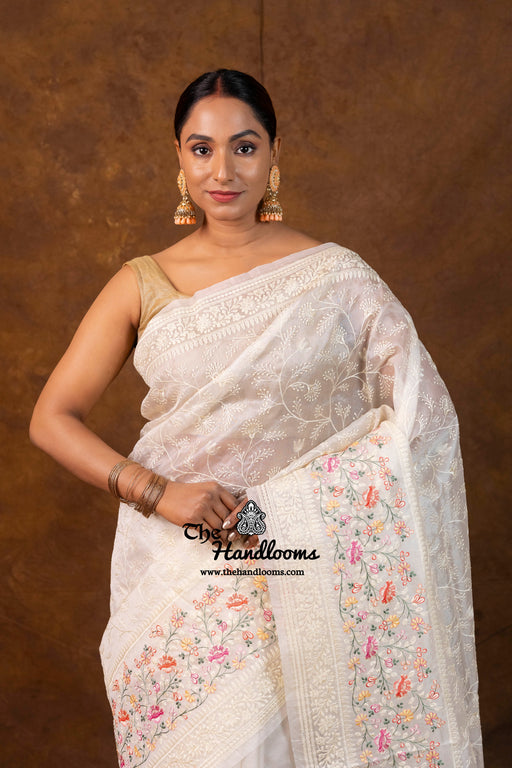 White Pure Organza Chikankari Handloom Banarasi Saree
