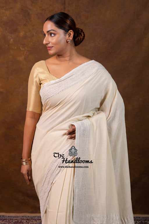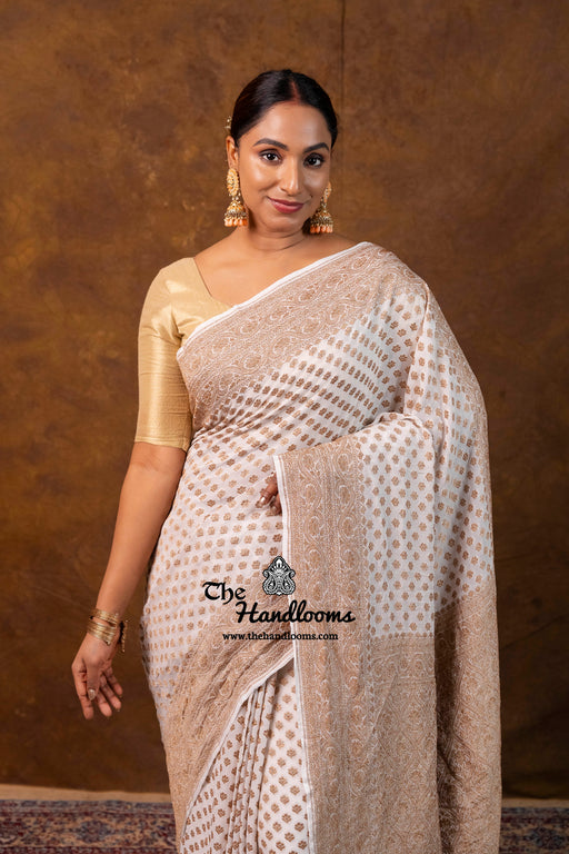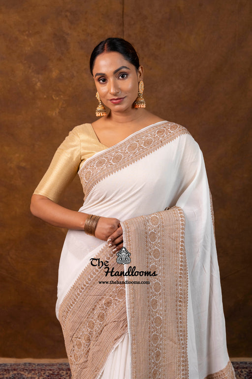 White Pure Khaddi Georgette Handloom Banarasi Saree - Antique Zari