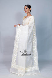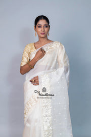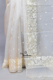 Pure Organza Chikankari Handloom Banarasi Saree Crafted from lightweight pure organza, this Banarasi saree showcases intricate chikankari embroidery—a centuries-old hand-embroidery technique that adorns the fabric with delicate floral and geometric patterns. The organza base offers a subtle sheen and breathable drape, making it ideal for warm-weather occasions while maintaining the grandeur of traditional Banarasi weaving. Each piece is handwoven by master artisans, ensuring authenticity and exclusivity. Perfect for festive celebrations, weddings, and formal gatherings, this saree balances heritage craftsmanship with contemporary elegance. The fine detailing and premium fabric quality reflect the artisanal excellence The Handlooms is known for