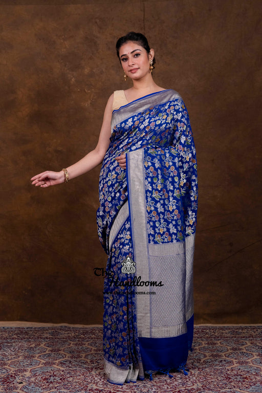 View full detailsExperience the timeless elegance of this Blue Pure Khaddi Georgette Handloom Banarasi Saree, distinguished by its luminous water zari embellishme...