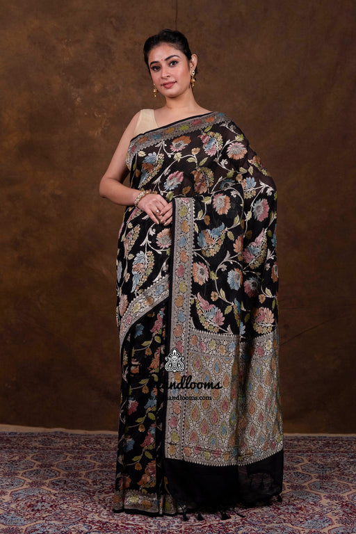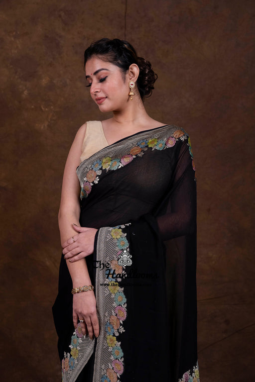 View full detailsExperience the timeless elegance of this Black Pure Khaddi Georgette Handloom Banarasi Saree, distinguished by its luminous water zari embellishm...