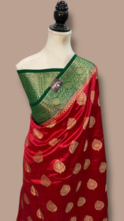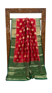 This Pure Dupion Silk Banarasi Saree is crafted with gold zari, designed to bring out the natural luster of the fabric, making it a luxurious choice for special occasions. The 'dupion' texture adds a unique subtle texture to the saree, giving it a timeless, classic look