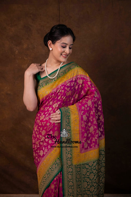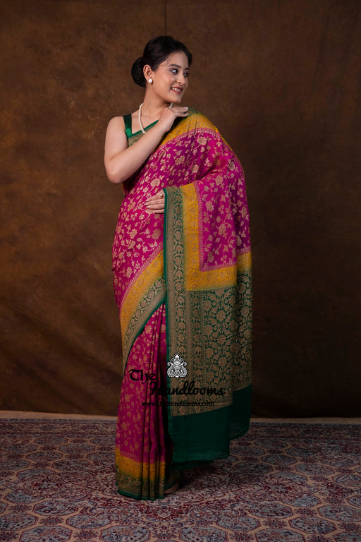 Khaddi Georgette Antique Zari Sarees from The Handlooms are a timeless tribute to Banarasi craftsmanship. Each saree is handwoven in Banaras using pure silk georgette and adorned with antique gold and silver zari. Perfect for weddings, festive occasions, or heirloom gifting, these drapes speak of elegance and legacy.