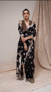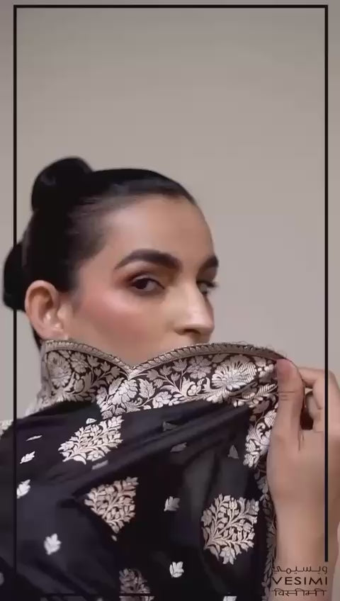 Black Pure Katan Silk Banarasi Handloom Saree - All Over Sona Roopa Jaal Work
