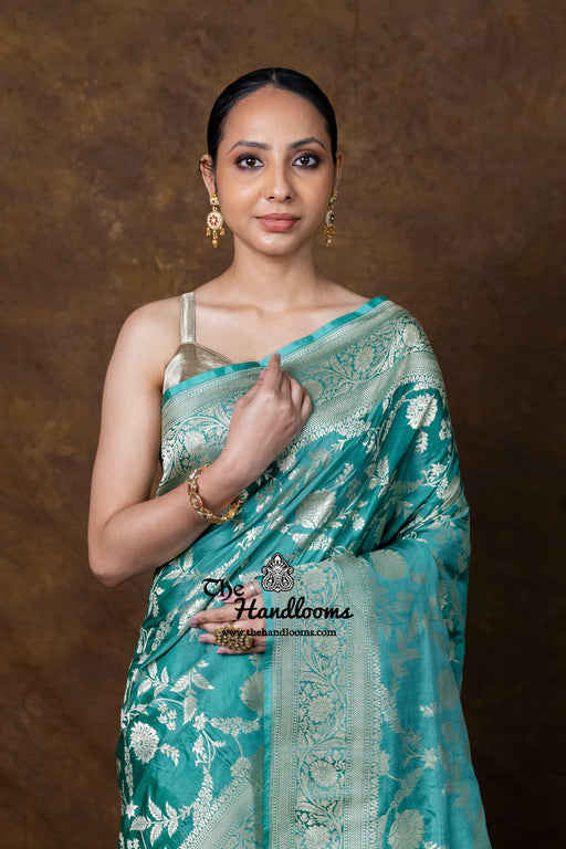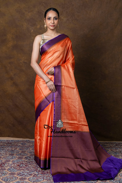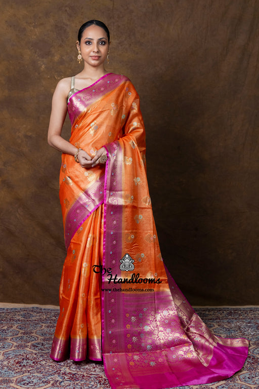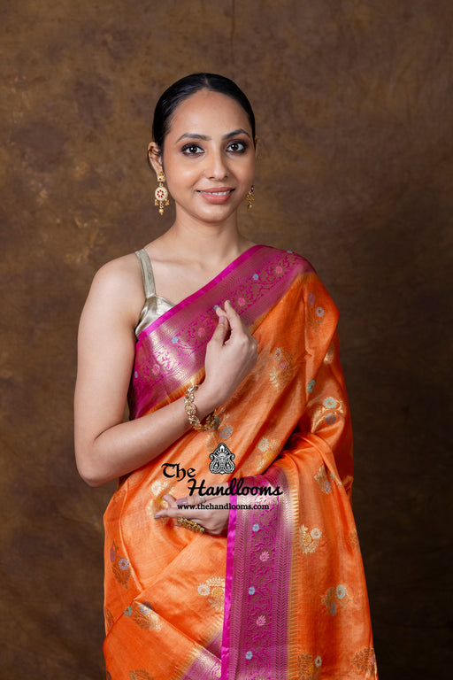 View full detailsCrafted from pure tussar silk, this Banarasi saree exemplifies centuries-old weaving mastery. The meenakari embellishment—intricate enamel-work i...