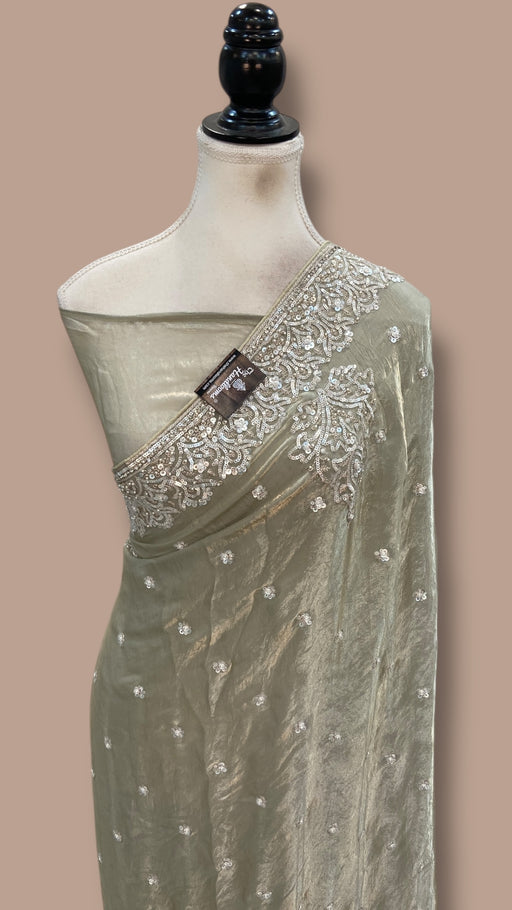 View full detailsExperience the timeless elegance of authentic Banarasi craftsmanship with this Pure Kora Silver Tissue saree. Meticulously handwoven using traditio...