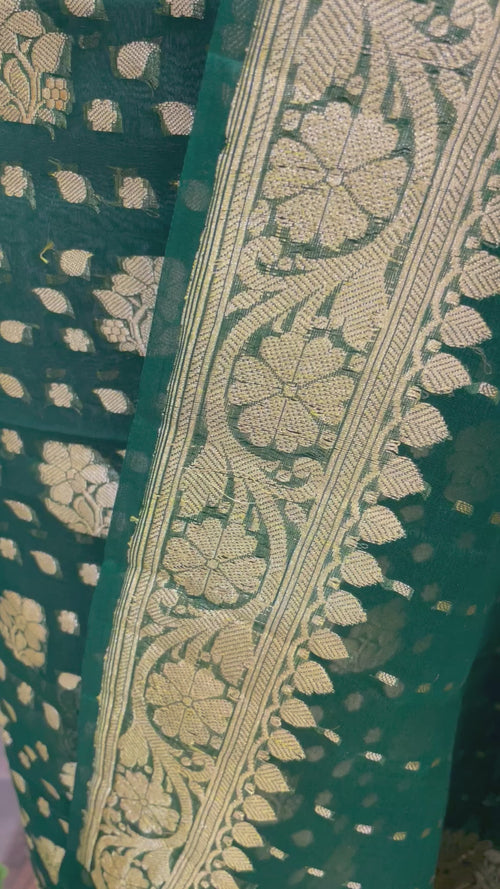 • Technique- The finest  Banarasi handloom weaving technique passed down through generations of weavers. The intricacy of the weave is such that it takes many days of exceptionally skilled effort, even post weaving, to simply cut-away the extra threads and let the pattern emerge.
