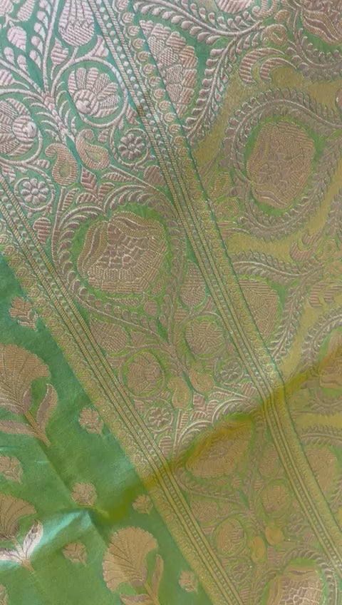 Green Pure Katan Silk Banarasi Handloom Saree - All over Jaal work