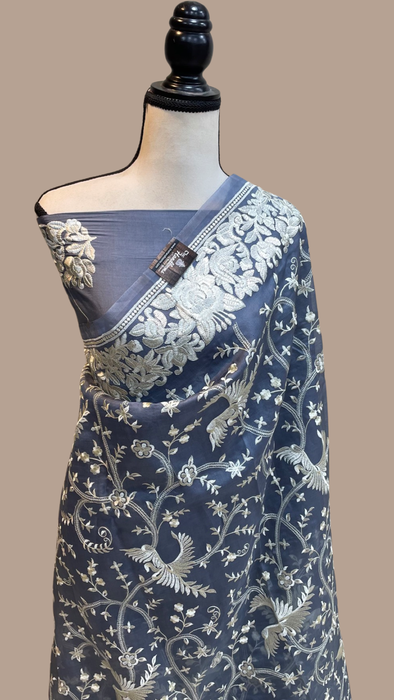 Grey Pure organza Chikankari Handloom Banarasi Saree