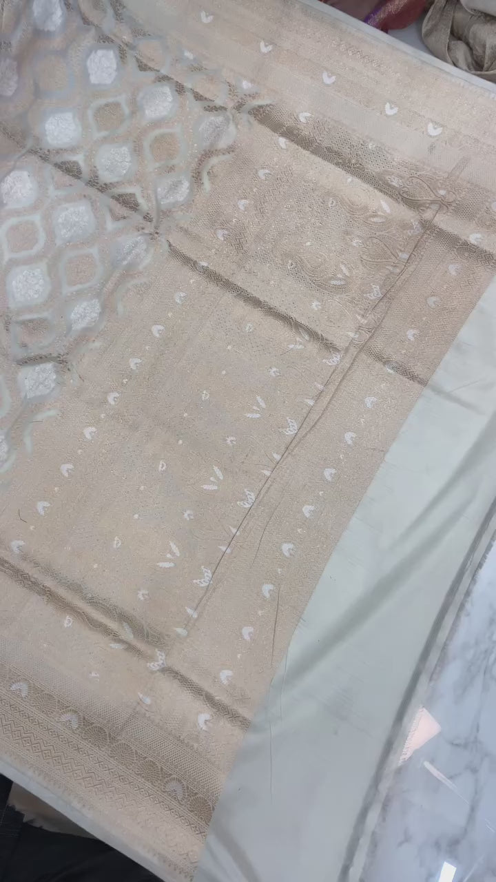 Off-white Pure Katan Silk Banarasi Handloom Saree - All over Sona Roopa Jaal work