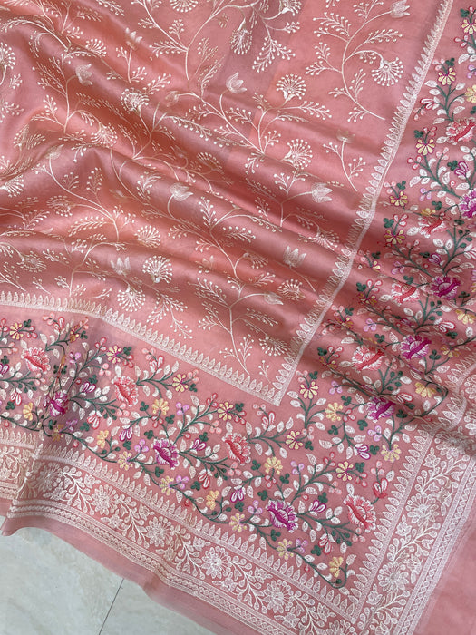 Peach Pure Organza Chikankari Handloom Banarasi Saree