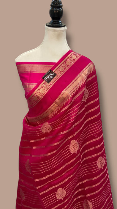 Like all magnificent things, it is very simple". Delicate, intricate and unforgettable. A quintessential, heritage Banarasi saree with time-honoured motifs woven in the exquisite kadhua style on gossamer kora silk.