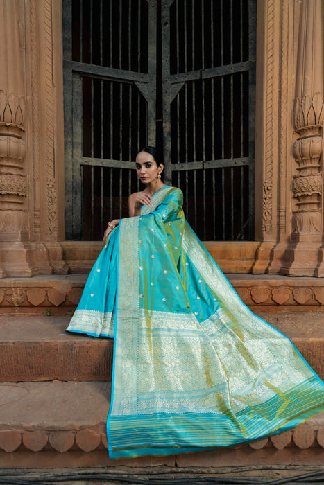 Technique - Made using a classic handwoven Banarasi Meenakari art that has been passed down through generations. Meenakari involves carefully adding colorful threads during the hand-weaving process. It also features a sturdy Kadwa weave, where each motif is hand-woven separately, taking more time but creating a durable pattern on the fabric.